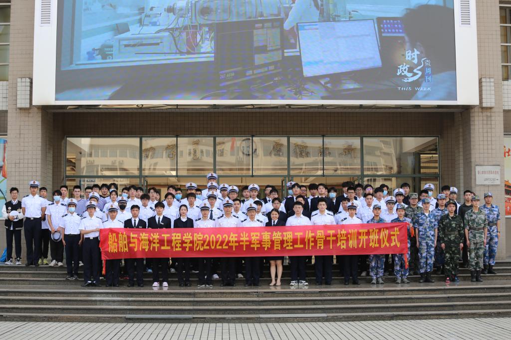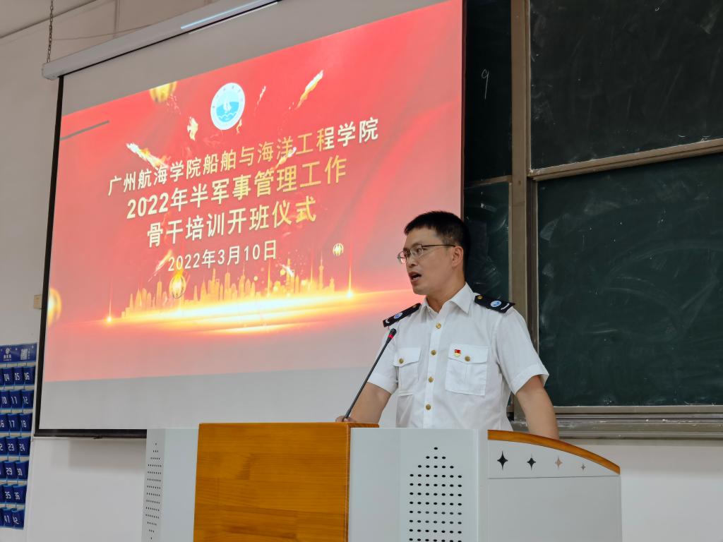 (船舶与海洋工程学院 供稿)3月10日下午,船舶与海洋工程学院2022年半军事管理工作骨干培训仪式在教学楼109顺利举行。船舶与海洋工程学院党委副书记黄赞大队长、全体中队长出席了会议,学院退役学生、院仪仗队、学院半军事管理骨干培训班教官及全体学员近一百名代表参加了本次开班仪式,仪式由中队长谭华京老师主持。