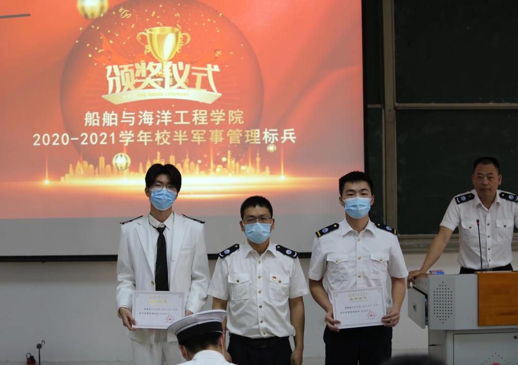 会上,中队长谭华京宣读了《船舶与海洋工程学院关于表彰2020-2021学年校半军事管理标兵和优秀志愿者的决定》,表彰了周辉雄等6名半军事管理标兵,授予吴志豪等9名同学“优秀志愿者”称号,学院党委副书记大队长为各获奖同学颁奖。