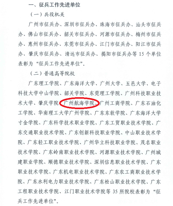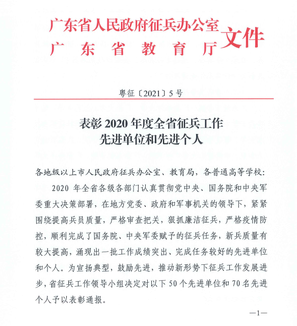(学工处供稿)近日,广东省人民政府征兵办、广东省教育厅联合下发《表彰2020年度全省征兵工作先进单位和先进个人》(粤征﹝2021﹞5号),我校被评为广东省“征兵工作先进单位”,钟聪仕被评为广东省“征兵工作先进个人”。这是我校连续第六年被授予“征兵工作先进单位”荣誉称号。