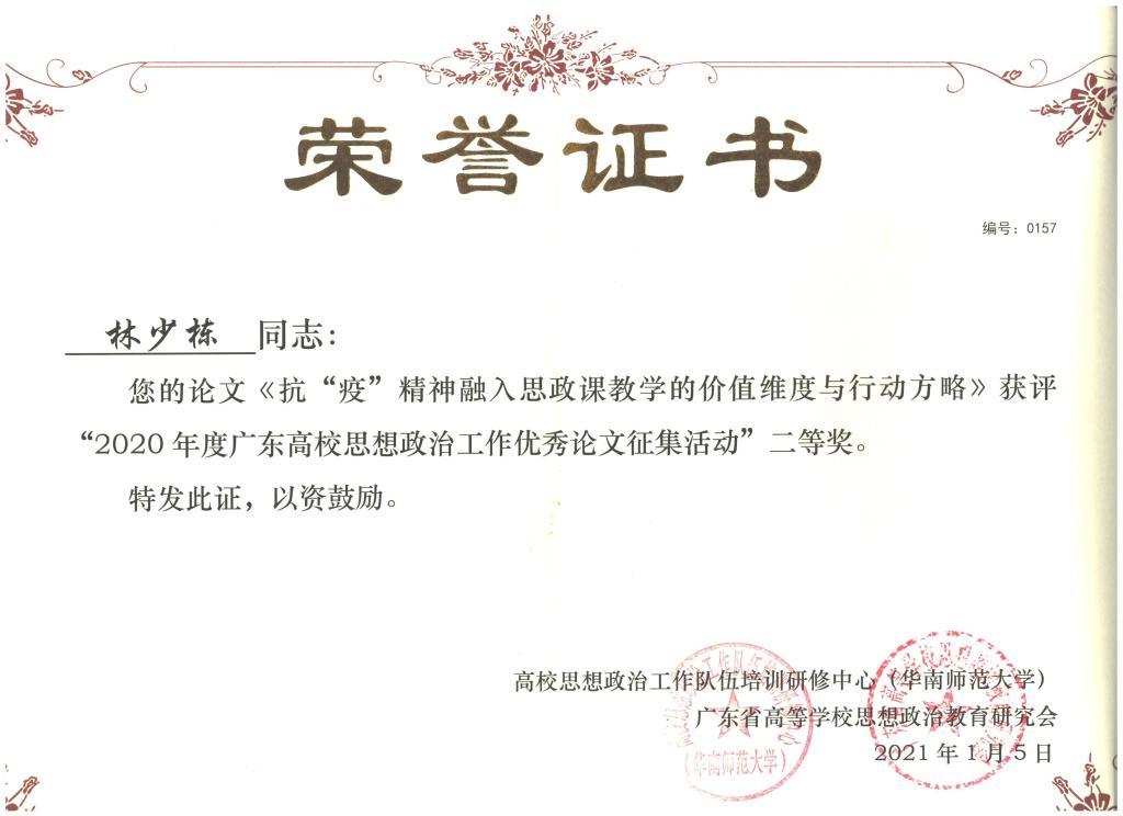 经组织动员、个人申报、组织评审,我校共推荐10篇论文参加活动。最终,明胜m88官网林少栋老师撰写的论文《抗“疫”精神融入思政课教学的价值维度与行动方略》荣获二等奖;港口与航运管理学院陈磊磊、程佳雪老师的论文《“课程思政”背景下高校辅导员与专业课教师协同育人工作研究》和明胜m88官网吴成结老师撰写的论文《一日生活制度思维下如何创新培养新时代大学生》荣获三等奖。