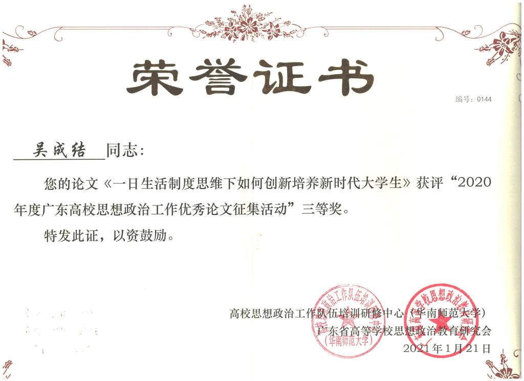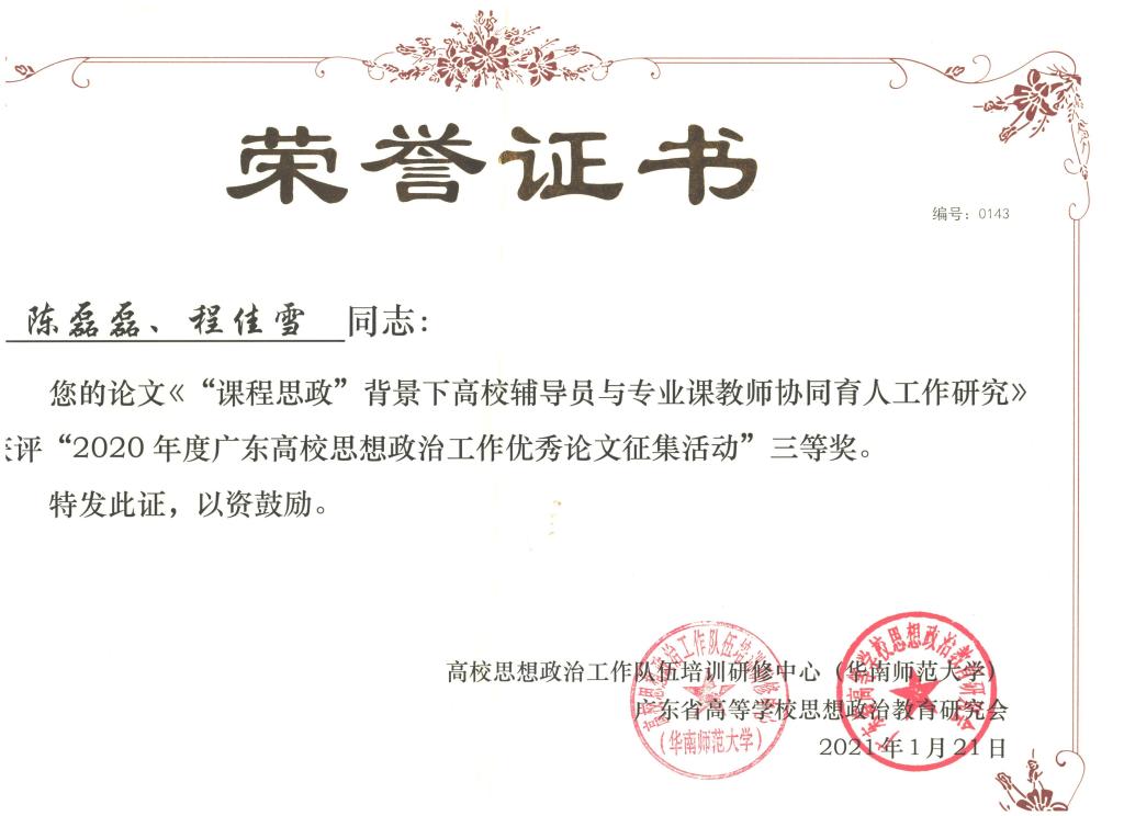 据悉,本次论文征集活动是由高校思想政治工作队伍培训研修中心(华南师范大学)、教育部高校辅导员培训和研修基地(华南师范大学)、广东省高等学校思想政治教育研究会联合开展,旨在引导高校思想政治工作者围绕落实立德树人根本任务,总结工作经验、加强工作研究、提升理论素养,推动高校思想政治工作队伍素质能力提升。本次活动共征集论文来自123所院校的论文839篇,经过专家评审,评出一等奖30篇,二等奖60篇,三等奖120篇,优秀奖150篇。
