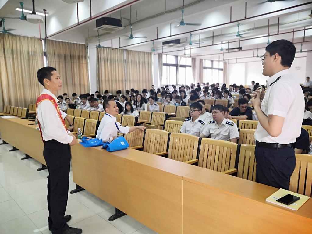 蔡船长作报告时,首先向大家简要介绍了去年参加表彰大会的经历。习近平总书记对劳动的尊重,对劳动者的关心,党和国家高规格表彰全国劳模和先进工作者,让身为其中一员的蔡船长深受感动和鼓舞。随后,蔡船长回顾了自己从普通水手逐步成长为一名技术过硬的拖轮船长的十年工作日常,特别指出在母校半军事管理的熏陶下养成了规律有序的学习生活习惯和勤恳踏实的工作作风,帮助他在长期的一线工作岗位上练就了娴熟过硬的驾驶技术,做到25年拖带作业“零”事故。蔡船长还参与完成了南沙三期码头泊位沉箱作业、港珠澳大桥岛隧工程沉管浮运与系泊作业、全球独一无二的无动力“瑞典桥湿”桥面顺利出坞装船等重大任务,让在场师生赞叹不已。