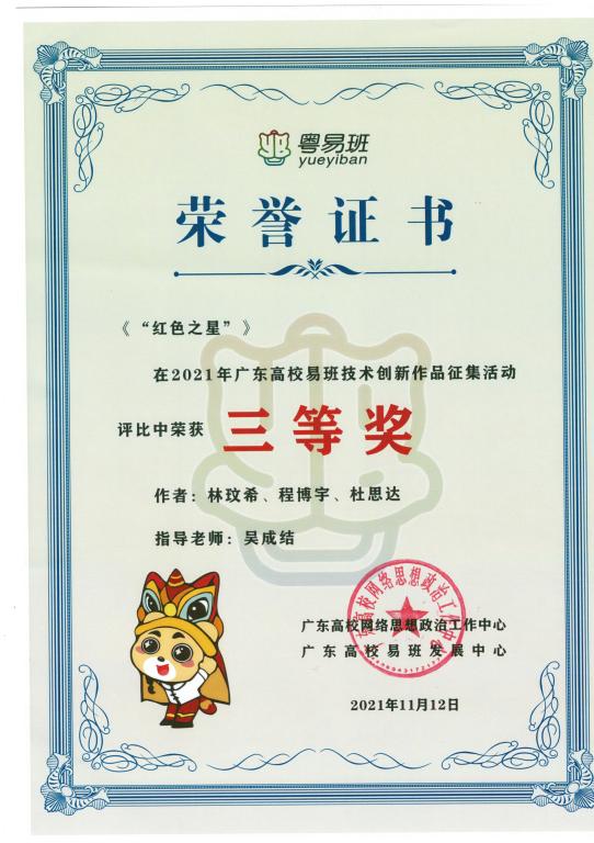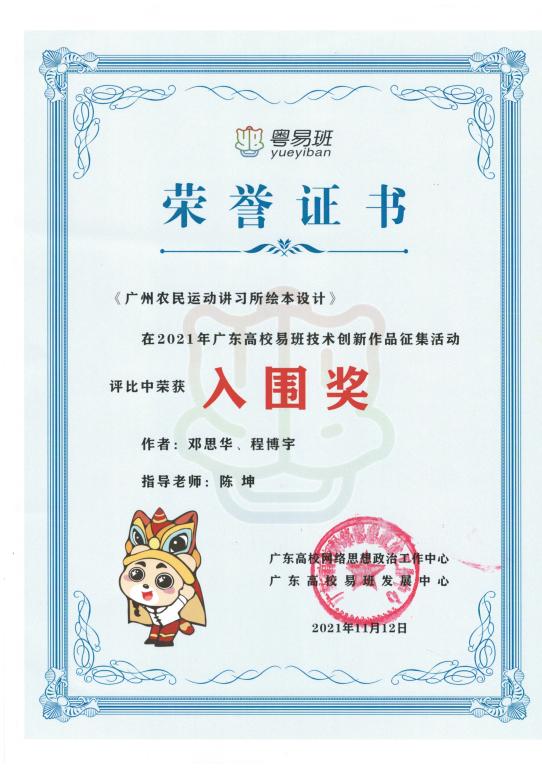 经过现场激烈的评审,我校推荐的作品《红色之星》(学生团队:林玫希、程博宇、杜思达,指导老师:吴成结)获得大会“创新创意方案类”三等奖;校推荐的作品《广州农民运动讲习所绘本设计》(学生团队:邓思华、程博宇,指导老师:陈坤)获得大会“创新创意方案类”入围奖。