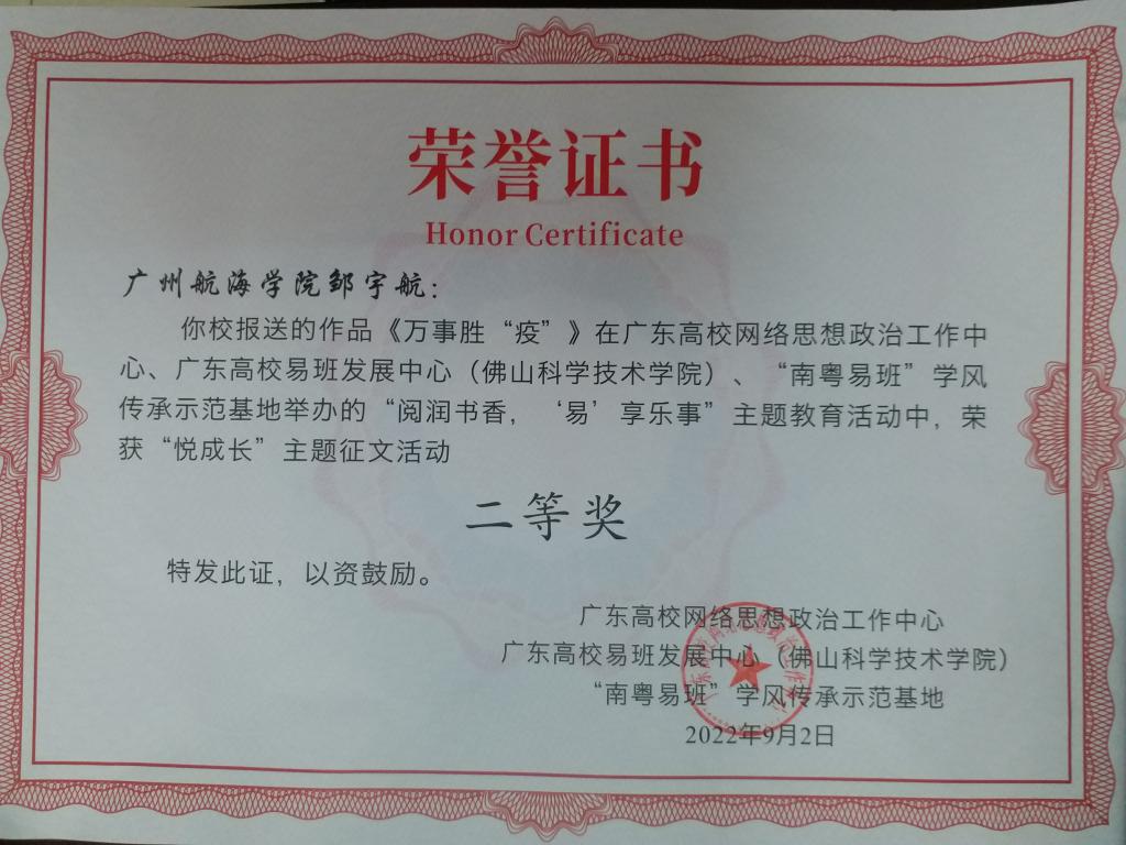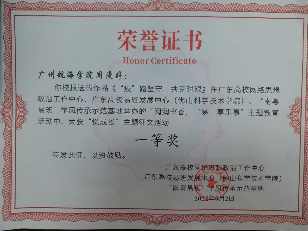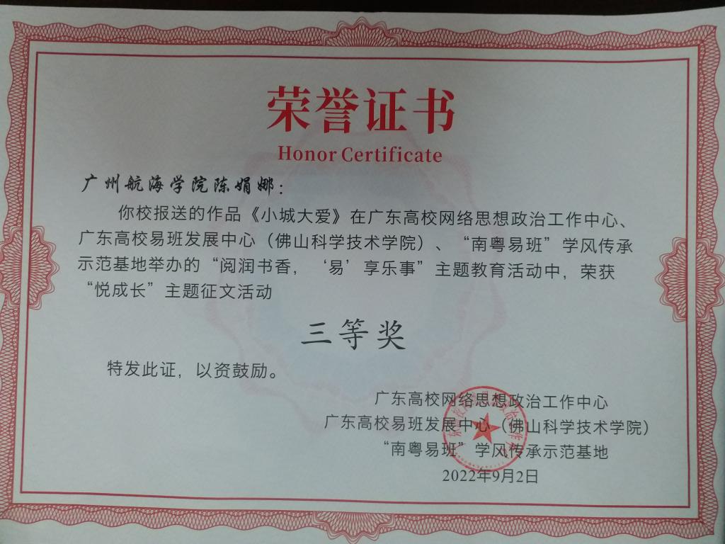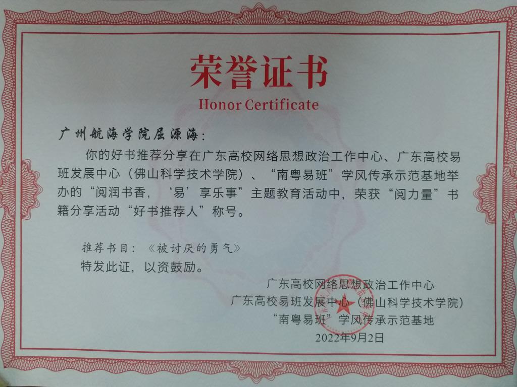 (学工处 供稿)近日,由广东高校网络思想政治工作中心、广东高校易班发展中心(佛山科学技术学院)、“南粤易班”学风传承示范基地联合举办的“阅润书香,‘易’享乐事”主题教育活动结果公布,共评选出“阅力量”书籍精彩评论30条;“悦成长”主题征文作品一等奖8项,二等奖11项,三等奖14项。经贸学院周漫婷的作品《‘疫’路坚守,共克时艰》获主题征文一等奖,船海学院邹宇航的作品《万事胜“疫”》获主题征文二等奖,经贸学院陈娟娜的作品《小城大爱》获主题征文三等奖,土木工程学院屈原海同学凭借推荐《被讨厌的勇气》一书,获“阅力量”书籍分享活动“好书推荐人”称号。