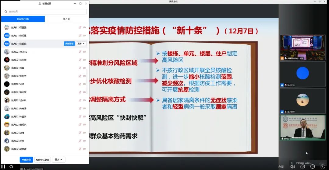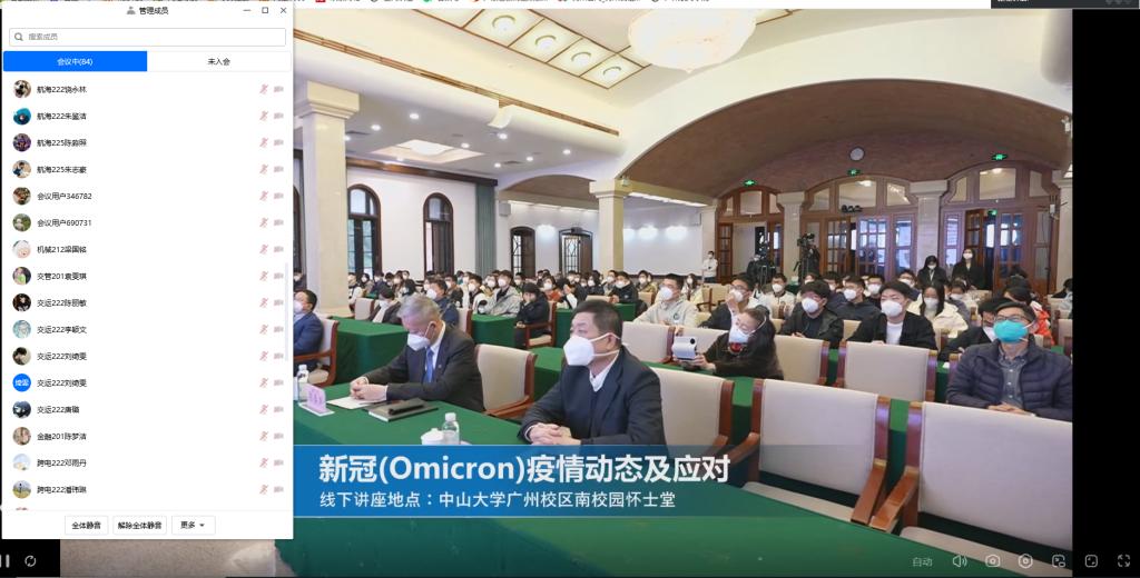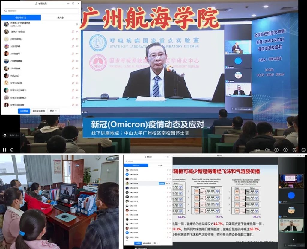 为普及新冠疫情动态及应对方案,12月15日下午15:00,由中山大学、清华大学、北京大学主办的全国高校抗疫大讲堂在中山大学举行,并通过网络平台向全国高校师生和社会公众直播。中国工程院院士、“共和国勋章”获得者、著名呼吸病学学家钟南山教授给全国高校学生带来一堂科学防疫专题讲座,主题为《新冠(Omicron)疫情动态及应对》。学工处组织学工团队和学生通过腾讯会议、自主学习、线下观看等方式观看了讲座。