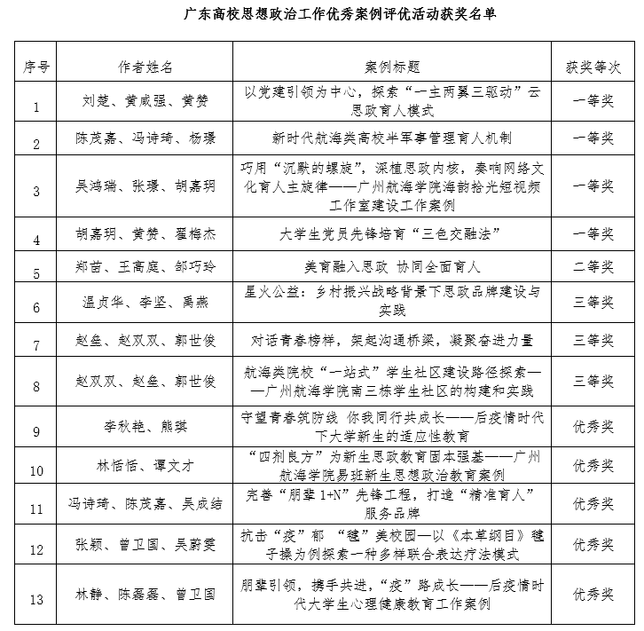 (学工处 供稿)为贯彻习近平新时代中国特色社会主义思想,深入学习贯彻党的二十大精神,充分展示辅导员工作的优秀成果,推广先进经验,提升辅导员工作的专业化和科学化水平,表彰先进,推动高校思想政治工作队伍建设,高校思想政治工作队伍培训研修中心 (华南师范大学)和广东省高等学校思想政治教育研究会组织开展了广东高校学生工作案例评优活动。我校在该项活动中取得了一等奖4项,二等奖1项,三等奖3项,优秀奖5项的优异成绩。