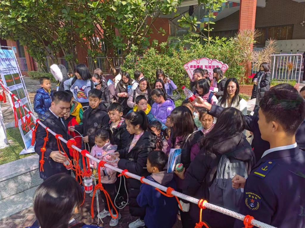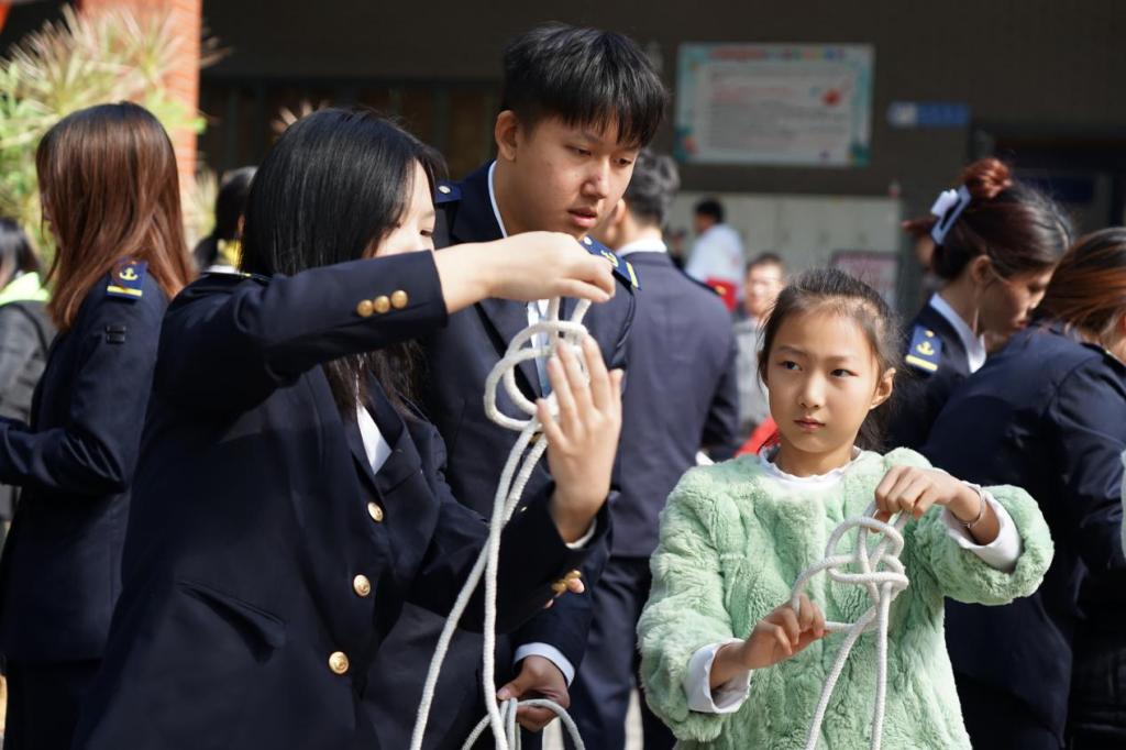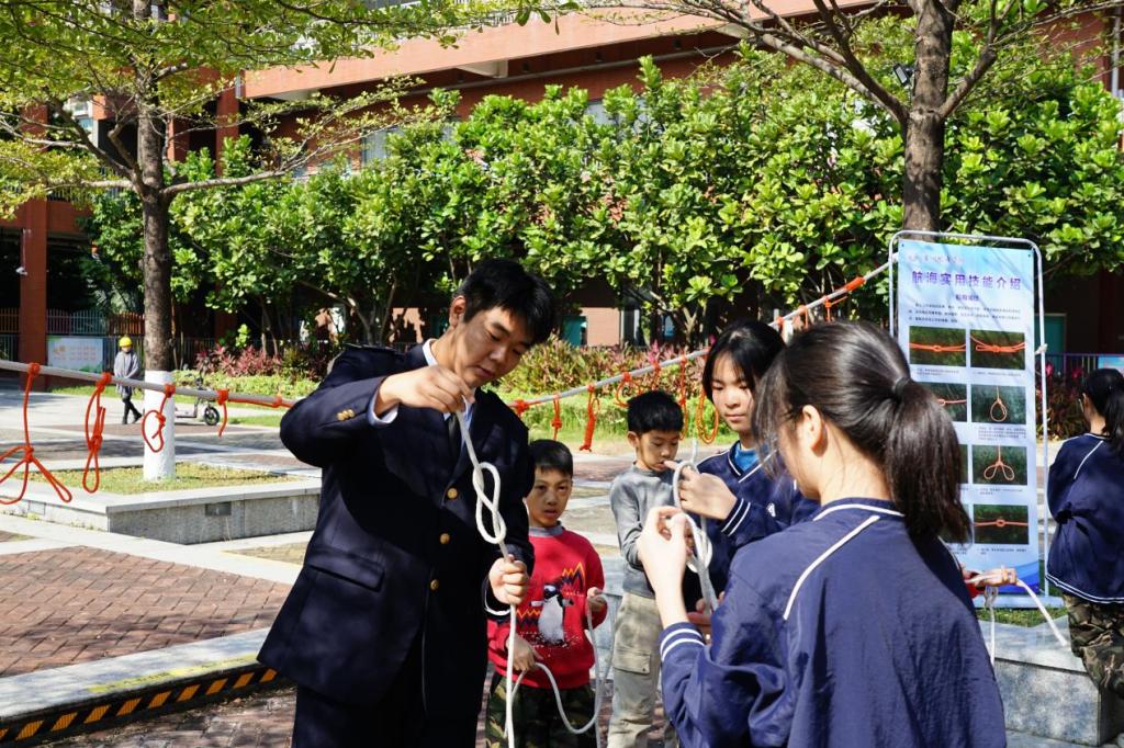 在现场实操与互动体验环节,我校何淋老师带领航海技术专业的学生宣讲员针对手旗旗语、救生衣、绳结分类、绳结打法及应用等内容展开现场教学演示及互动,参与活动的小朋友们也参与到绳结制作中,使他们对航海技能与日常生活相关知识有了一定了解和印象,感受中华航海文化的博大精深,进一步增强青少年蓝色国土观念、海洋意识和国防意识。