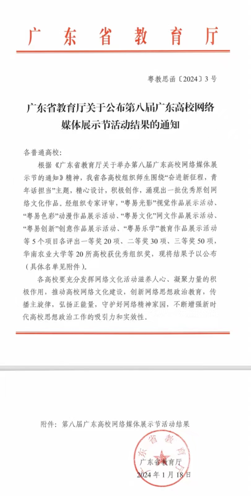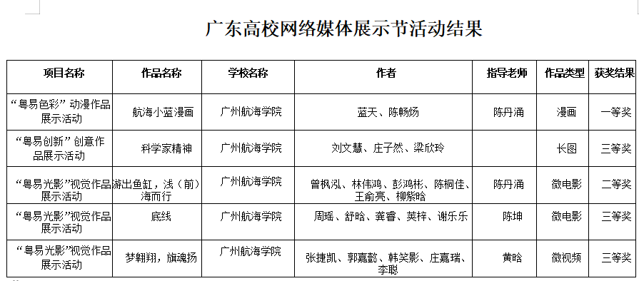 (明胜m88官网 供稿)近日,广东省教育厅公布了第八届广东高校网络媒体展示节活动评选结果,我校师生作品获一等奖1项,二等奖1项,三等奖3项,累计获得5项奖励。