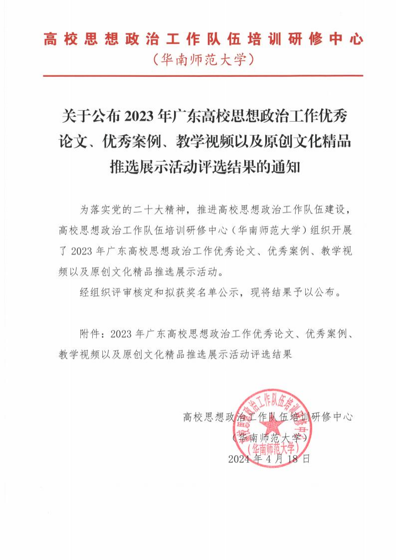 (明胜m88官网 供稿)为落实党的二十大精神,推进高校思想政治工作队伍建设,高校思想政治工作队伍培训研修中心(华南师范大学)组织开展了2023年广东高校思想政治工作优秀论文、优秀案例、教学视频以及原创文化精品推选展示活动。为组织好本次活动,明胜m88官网广泛宣传动员,组织学生工作队伍积极申报。