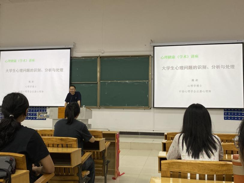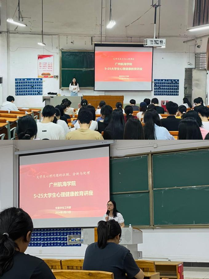 (明胜m88官网 供稿)为进一步普及大学生心理健康知识,引导学生树立自助、求助意识,学会理性面对困难和挫折,增强学生心理健康素质,结合我校2024年“5.25”大学生心理健康月系列活动开展计划,5月23日,我校分别在黄埔、琶洲两校区开展《大学生心理问题的识别、分析与处理》和《大学生压力与应对》专题心理讲座。讲座分别由我校基础人文社科部心理学博士魏昶副教授及心理健康教育与咨询中心专职教师谢特秀主讲,全校共300余名学生代表参与了本次讲座。