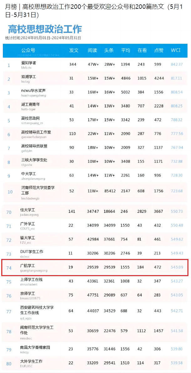 其中,“广航学工”公众号上半年发布推文73篇,总阅读量17.7万,较去年同期提高53.9%(11.5万),阅读量2424次/篇。在教育部“辅导员工作室”公众号和清博数据共同评选的“高校思想政治工作200个最受欢迎公众号”月度排行榜中,分别在一月和五月排名全国第70名和第74名,在全国和广东省的公众号均处于第一梯队。“广航学工”视频号上半年发布短视频49部,总播放量24万+,平均播放4897次/部。各类直播活动共计8场,累计时长16小时,累计观看观众2.2万人次,累计观看次数3.2次,点赞3.7万次,极大地增强了“广航学工”网络思政阵地的活力。