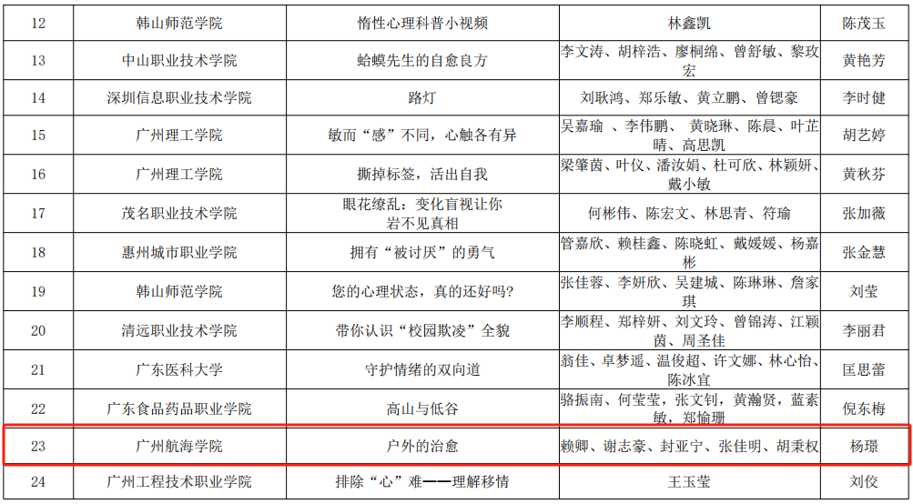 近日,广东省2024年“5•25大学生心理健康月”系列活动评选结果揭晓,我校航运学院赖卿、谢志豪、封亚宁、张佳明、胡秉权五位同学创作的心理科普短视频《户外的治愈》(指导老师:杨璟)和海事法律与交通管理学院张颖老师的微课作品《拒绝EMO,自然疗愈》)分别获心理科普短视频二等奖和心理微课二等奖。