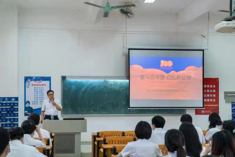 苏书记首先回首了百年前,国难当头时,革命先辈们怀着“救国”的理想,为旧中国摸索出了新出路。他运用一个个革命先驱的故事,勉励青年学生要将 “坚持真理、坚守理想,践行初心、担当使命,不怕牺牲、英勇斗争,对党忠诚、不负人民”的伟大建党精神落实到学习生活中去。其次,我们应当时刻牢记习近平总书记 “以史为鉴,开创未来的九个‘必须’”的根本要求,更加坚定、自觉地牢记初心使命、开创美好未来。最后,苏书记希望同学们能够不负青春,不负韶华,勇立潮头,做无愧于历史、无愧于时代、无愧于青春的奋进者、开拓者和奉献者。