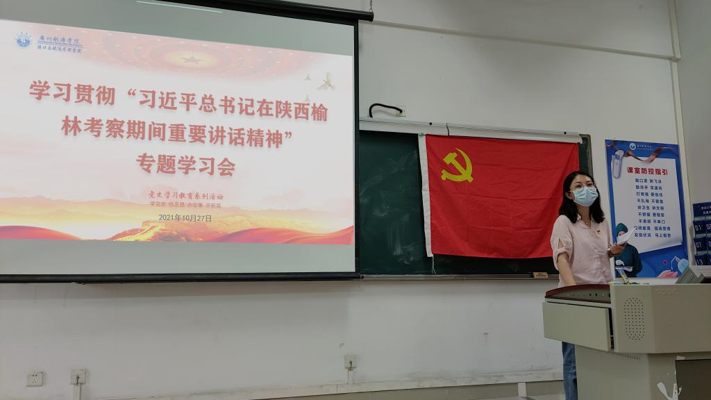 (港航学院 供稿)10月27日,港航学院学生第一党支部召开“学习贯彻习近平总书记在陕西榆林考察期间重要讲话精神”专题学习会,传达学习习近平总书记在陕西榆林考察时的重要讲话精神,并同学习领会习近平总书记“七一”重要讲话精神贯通起来,同学习领会习近平总书记关于党史和党史学习教育的系列重要论述结合起来,引导学生党员坚决落实党中央决策部署,完整、准确、全面贯彻新发展理念,解放思想、改革创新、再接再厉,更好奋进新征程、创造新业绩、建功新时代。本支部72名党员参与专题学习会,会议由党支部书记吴蔚雯老师主持。