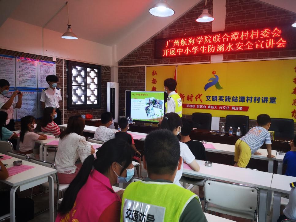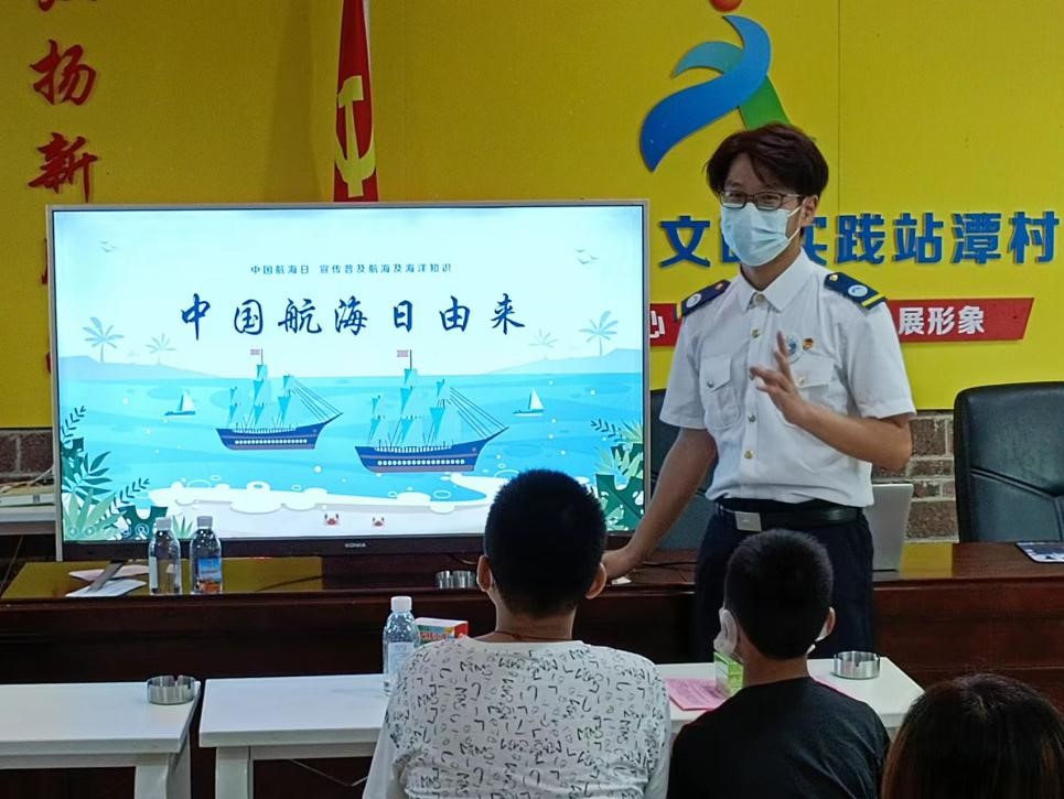 关爱孩子成长,助力乡村振兴。当天下午,团队潭村文明实践站举办了一场内容丰富、精彩生动的科普讲座。团队成员为学生们介绍了中国海洋文化,从“中国航海日”到中国航海史,从“郑和宝船”到中国船舶发展史,内容深入浅出,引人入胜,让乡村的孩子们接触到航海的历史,感受到了海洋强国建设的艰辛历程。除此之外,团队成员也结合当地的实际,给学生们带来安全教育宣讲,为孩子们的安全添砖加瓦,用生动直接的歌唱传递关怀,与孩子们进行心灵上的对话。
