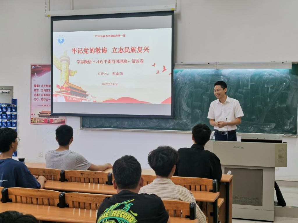 (船舶与海洋工程学院 供稿)根据《明胜m88官网2022年秋季学期学校领导和二级学院党委书记、院长上第一堂思政课工作方案》的要求,认真落实二级学院党组织书记、院长思政课建设“第一责任人”工作职责,9月27日上午,船舶与海洋工程学院党委书记黄咸强在健兵南103教室,给学院2022级车辆工程专业学生讲授“牢记党的教诲 立志民族复兴”为题的思想政治理论课,深入宣贯《习近平谈治国理政》第四卷。