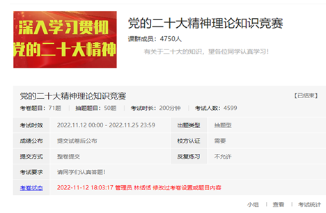 活动聚焦党的二十大报告,通过校易班平台优课群开设了“党的二十大报告”专题学习优课,并通过微信公众号组织了党的二十大精神学习接力活动,通过易班平台轻应用,从题库中随机抽取50道题目,供学生竞答,内容涵盖习近平总书记在中国共产党第二十次全国代表大会上所作的报告、《中国共产党章程(修正案)》等。活动共吸引了4749名学生参加了活动,根据活动规则,共评出一等奖50名,二等奖100名,三等奖150名,优秀组织奖8个。