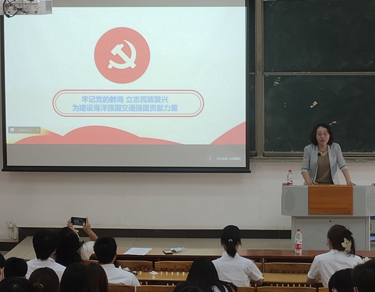 随后,周楠书记讲授主题为“学习党史·牢记使命”的党课。周书记以“党史发展脉络及学习意义”、“牢记党的教诲、立志民族复兴,为建设海洋强国交通强国贡献力量”为主要内容,以党史发展的三个阶段发生的大事要事为切入点,结合当代时政热点、先进人物故事,全面展现了建党百年以来的艰苦奋斗史、党领导全国人民取得的辉煌成就以及马克思主义中国化的最新成果。