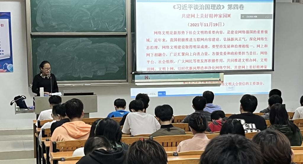 接着,林静老师带领全体同学学习《习近平谈治国理政》第四卷的部分内容,强调网络文明建设的重要性,并呼吁同学们要弘扬新风正气,积极传播网络正能量,要加强自身思想道德修养,明大德、守公德、严私德,以自觉行动共建网上美好精神家园。