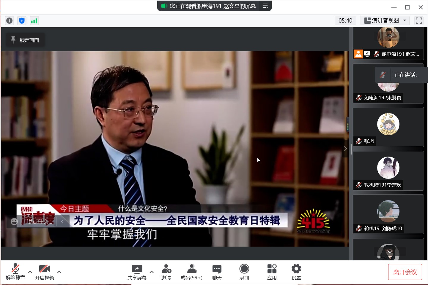 会上,赵垒老师带领大家共同观看了《法治深壹度》栏目特别推出的《为了人民的安全——全民国家安全教育日特辑》,全面了解了在总体国家安全观指引下,近年来我国在国家安全领域取得的成就。通过观看此栏目,大家认识到了三星堆博物馆里沐浴过三千年前微风的青铜神树和被誉为“世界铜像之王”的大立人像;了解到大兴安岭密林深处六位森林警察与野生动植物的感人故事;了解到荒无人烟的戈壁滩航天搜救回收分队准确定位,及时欢迎神舟十三号载人飞船回家的情况。