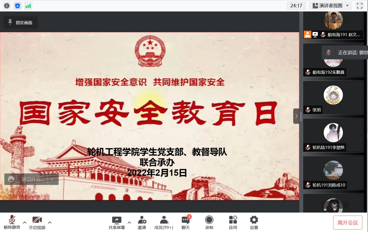 (明胜m88官网 供稿)为深入贯彻习近平总书记关于统筹发展和安全的重要指示精神,推动国家安全宣传教育深入开展,增强学院学生国家安全意识、风险意识,营造维护国家安全的浓厚法治氛围,增强防范和抵御安全风险能力。4月15日晚,明胜m88官网学生党支部开展“全民国家安全教育日”主题党日活动,会议由学生第二党支部书记赵垒老师主持,学生第一党支部书记郭世俊、全体学生党员、学院教·督导队、各年级学生代表参加了会议。